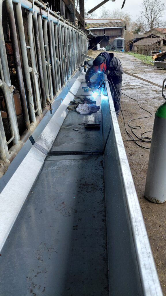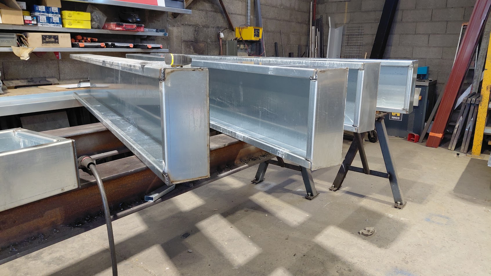 Auges fabriquées en tôle Galva de 3mm pliées et soudées en éléments grande longueur à l’atelier avec tirant en chaîne galvanisé pour une plus grande rigidité.